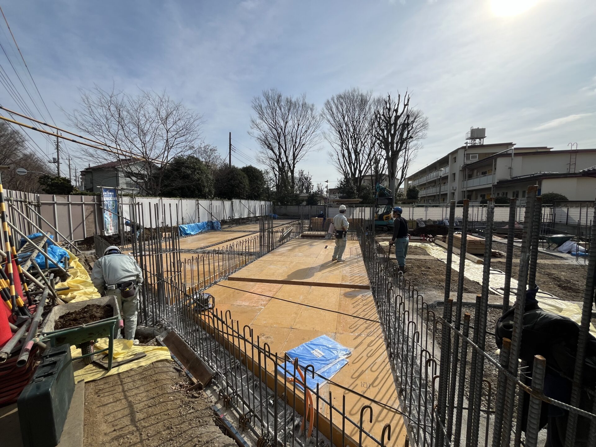 先日地中梁から配管を立ち上げたところまででしたが、その後1階床の型枠への墨出し、鉄筋が組まれたら床の電気配管(スラブ配管)、その後床コンクリートの打設という工程で進んでいます。