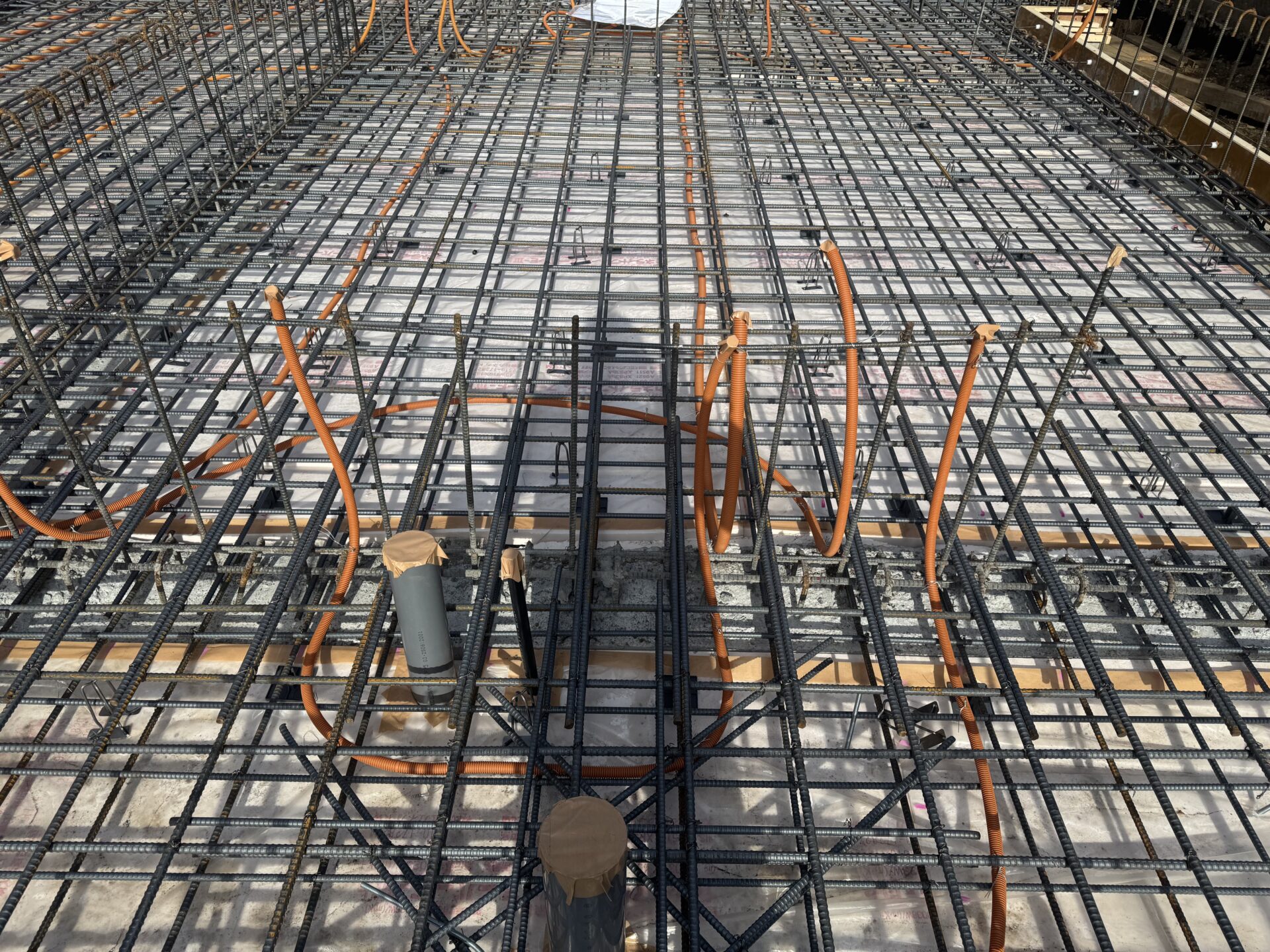 この現場、内側も外側も杉板を使った打ちっ放しやタイル仕上げが多かったり、天井も4mあったり、壁が天井まで届かず上部が吹き抜けになっていたりするので、床に配管を打込んでおかないといけない箇所が多くありますが床が広くフラットなので気持ち良く配管できます。