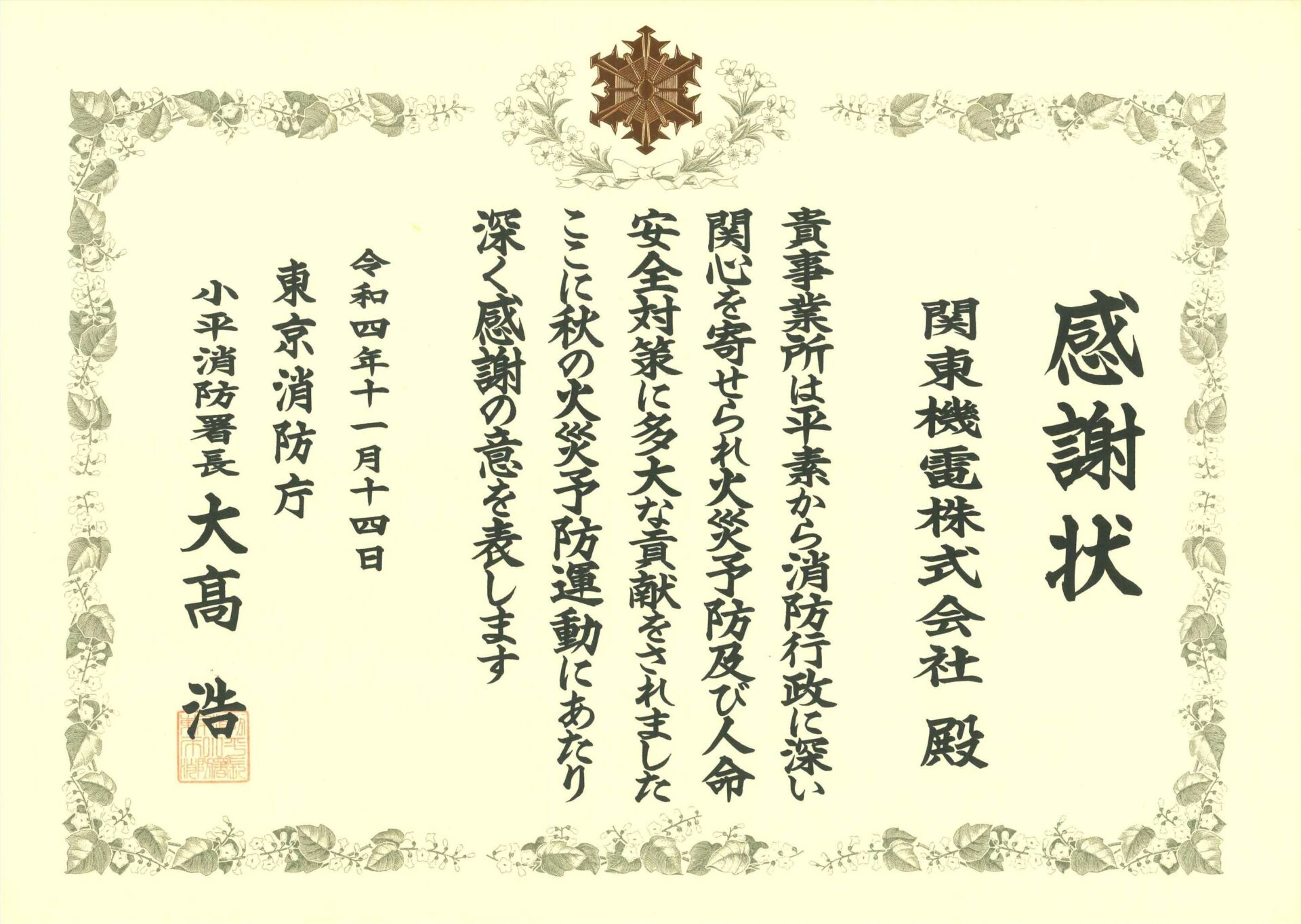 小平消防所長より秋の火災予防運動の感謝状を頂きました。